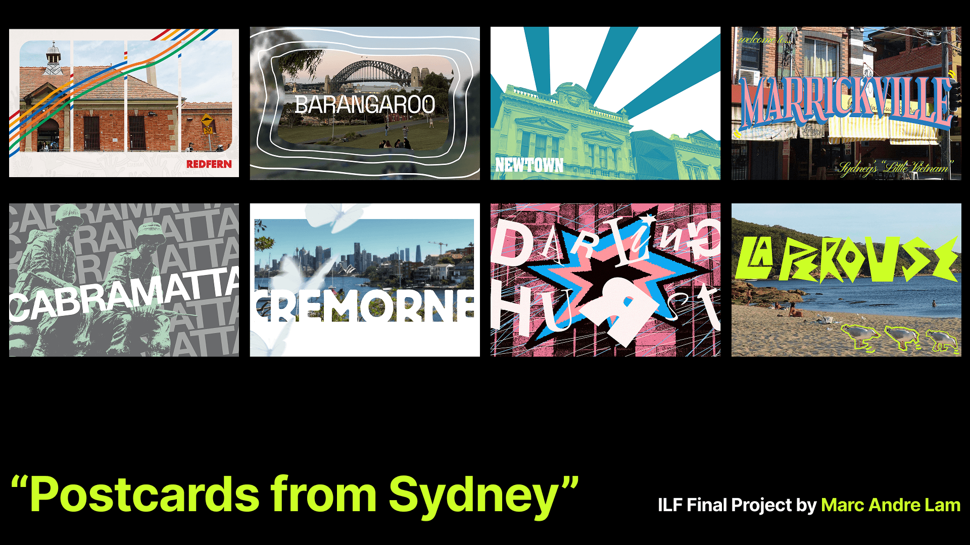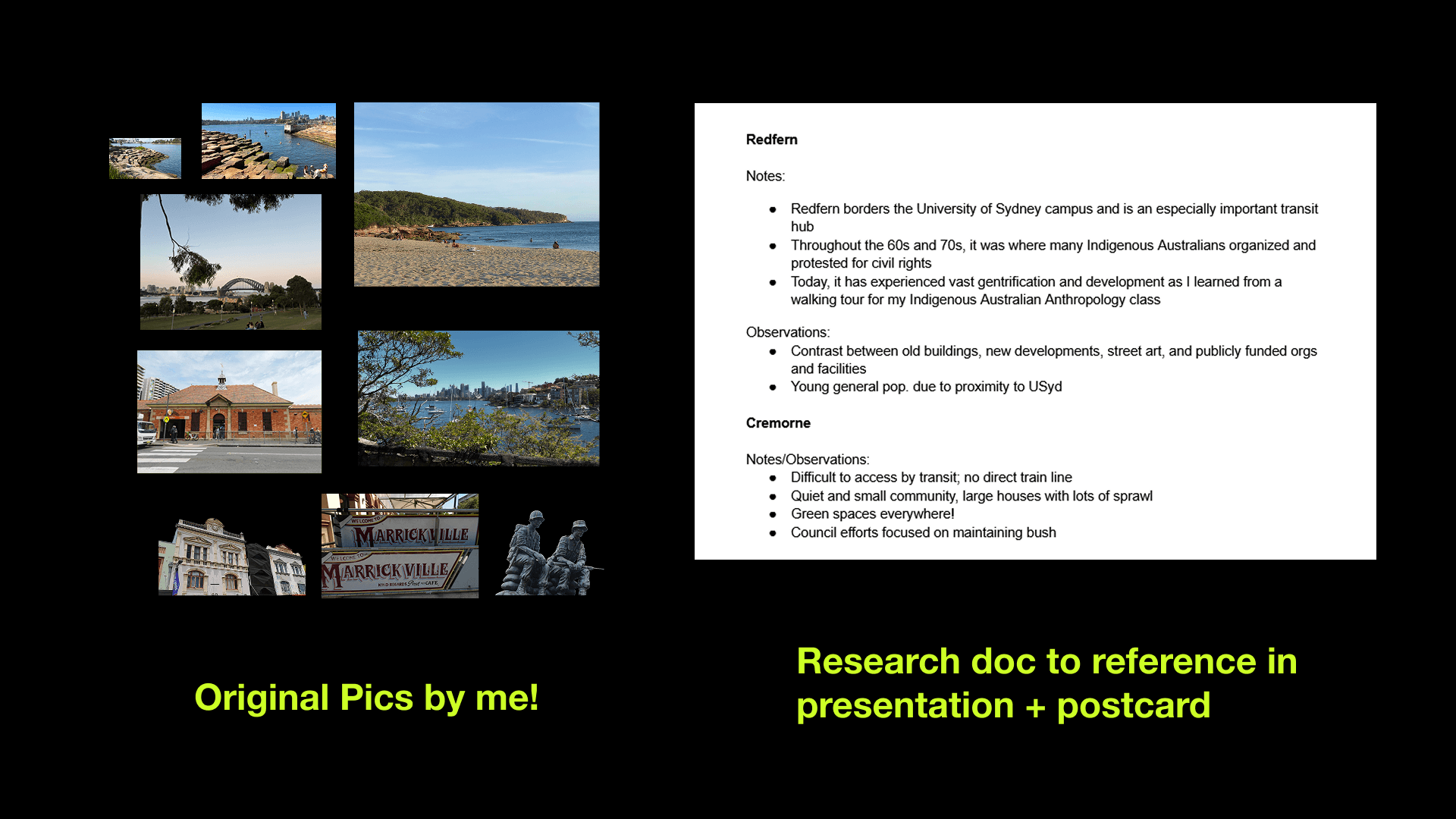To create each postcard, I used Photoshop to crop and edit photos as needed. I then used both Adobe Illustrator and Figma to add graphic elements. My focus was on capturing the mood, feelings, and beauty of each particular community. For each postcard, I made sure to have notes for their significance in the greater Sydney area, along with what I noticed walking around.
